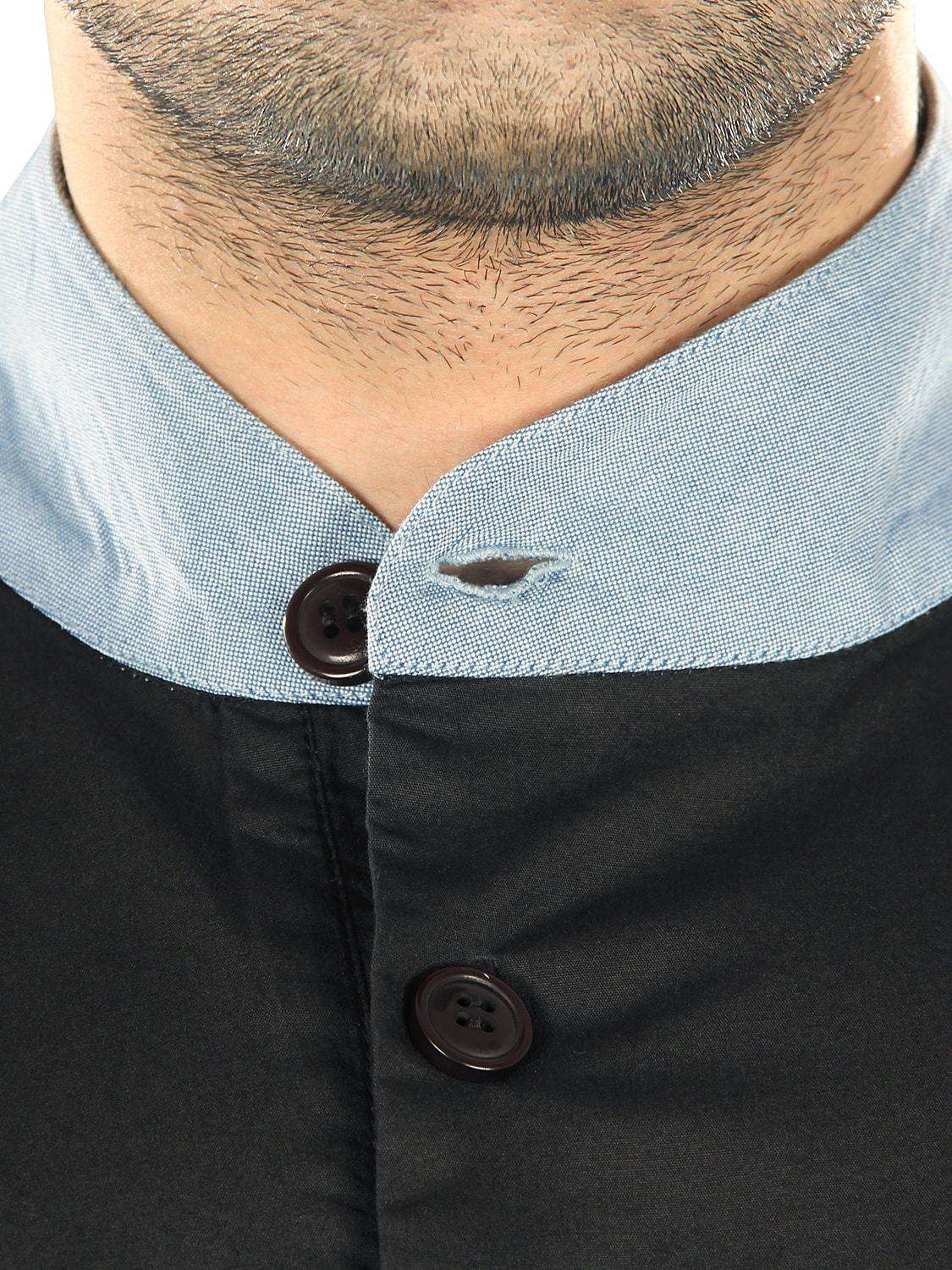 - Band collar, front open placket with button closure