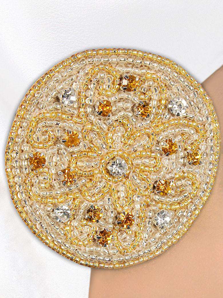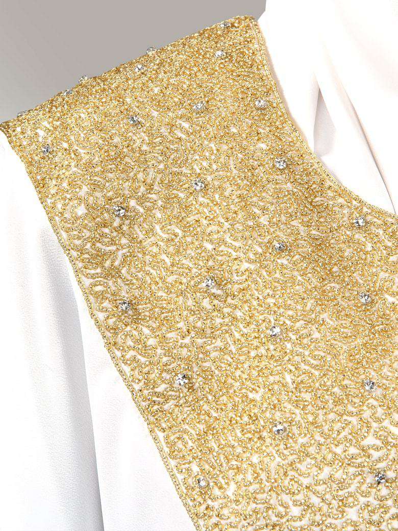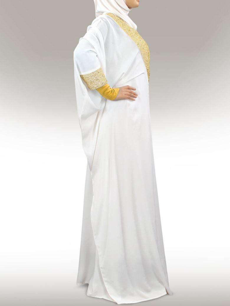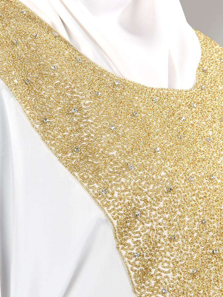 This elegant Kaftan in white is a perfect dress for special occasions, Golden bead hand embroidery work around neckline and sleeves cuff achieves that classy look