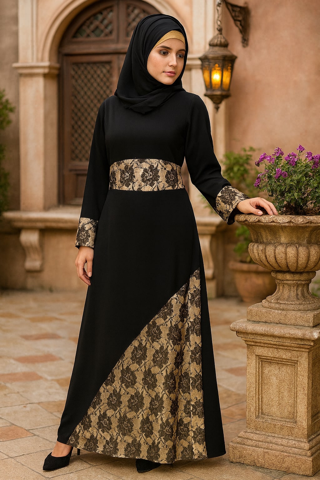 - Designer abaya with round neckline.