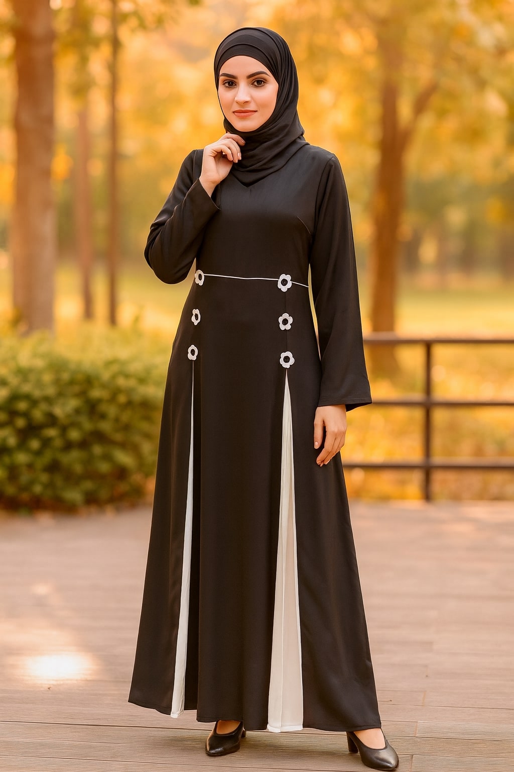 Amazing light weight Abaya at MyBatua with dual color pleats, beautifully detailed with crochet flowers, a complete dress for special occasions & parties